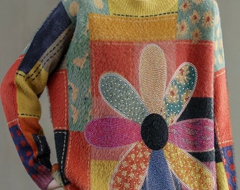 Sweater Turtleneck Knit Printed Peacock Berenik
